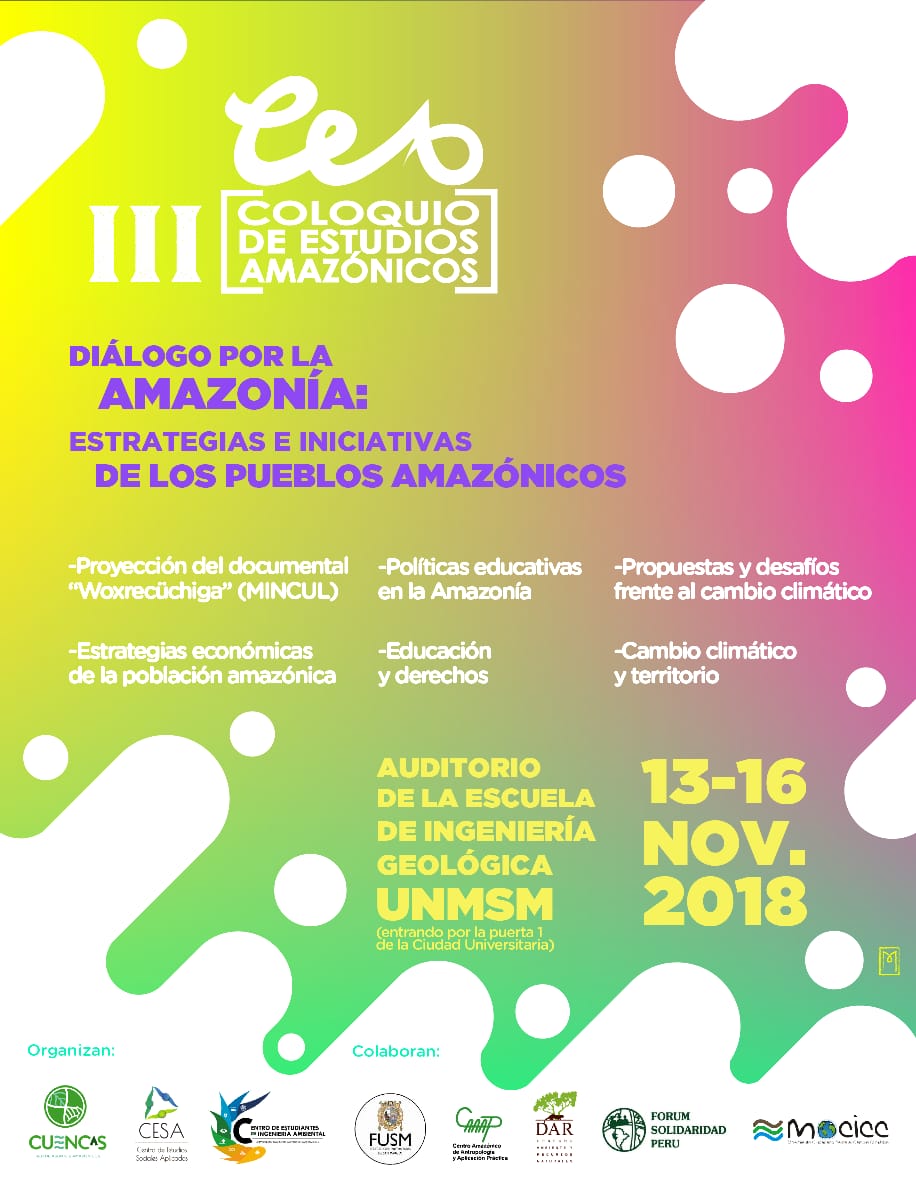 El III Coloquio de Estudios Amazónicos, es un evento organizado por Cuencas-Red de Asuntos Amazónicos y el Centro de Estudios Sociales Aplicados-CESA, que tiene como objetivos: