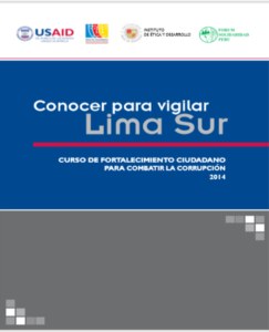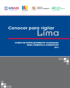 Si la corrupción ha sido endémica y persistente en el Perú, también lo ha sido la resistencia de las fuerzas de regeneración del país. Aunque queda todavía mucho, y muy difícil, por hacer contra esta lacra histórica, la ciudadanía y la sociedad civil han mostrado, contra todo y contra todos, que la resignación no es una opción. Forum Solidaridad Perú (FSP), parte del Grupo de Trabajo Contra la Corrupción, reafirma su compromiso en la lucha contra la corrupción, buscando siempre sinergias y coaliciones, lo más amplias posibles. Dejamos a continuación Guías (pdf) con Módulos de formación para cada uno de cinco (5) distritos judiciales en que se realizaron Cursos, durante los años 2014 y 2016. Realizados por FSP y Certificados por la Universidad Antonio Ruiz de Montoya (UARM).